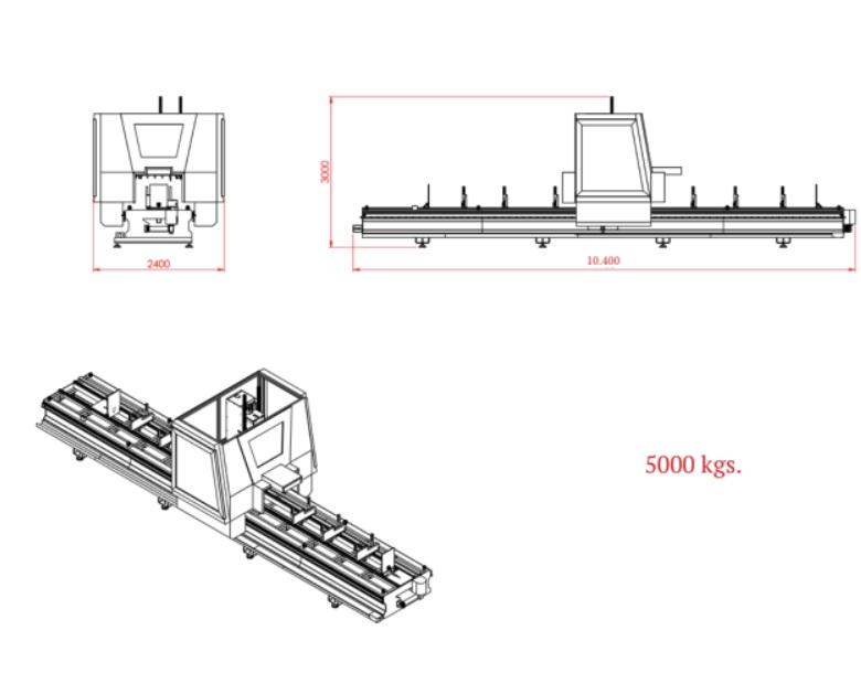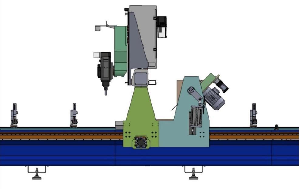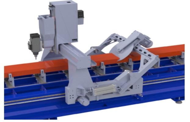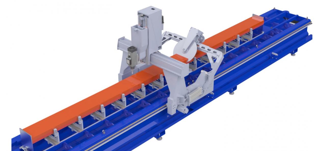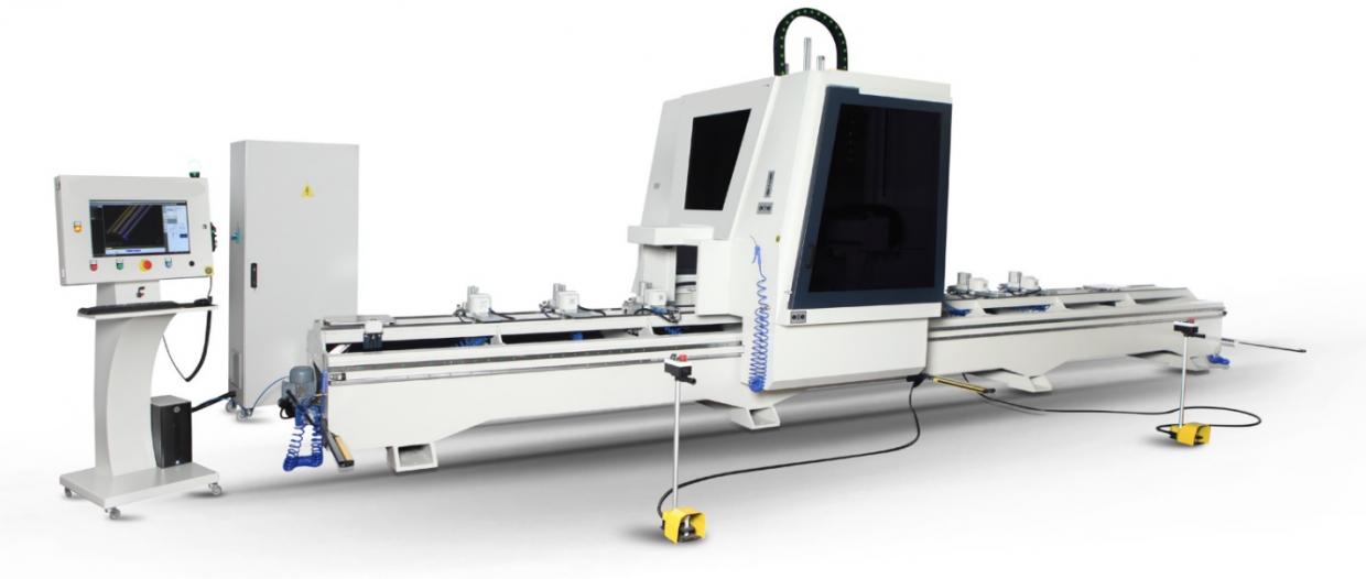 Éste CNC para corte y mecanizado de perfiles de aluminio (y otros metales o plásticos), de tipo PÓRTICO, está equipado con husillo rotativo programable para trabajar cualquier ángulo entre 0-180 grados y unidad independiente de corte inclinable automáticamente a 45-90-135 grados con hoja de sierra de 600 mm de diámetro, cambiador automático de herramientas, 12 mordazas de sujeción de perfiles, pasadores de referencia neumáticos y software de programación 3D.