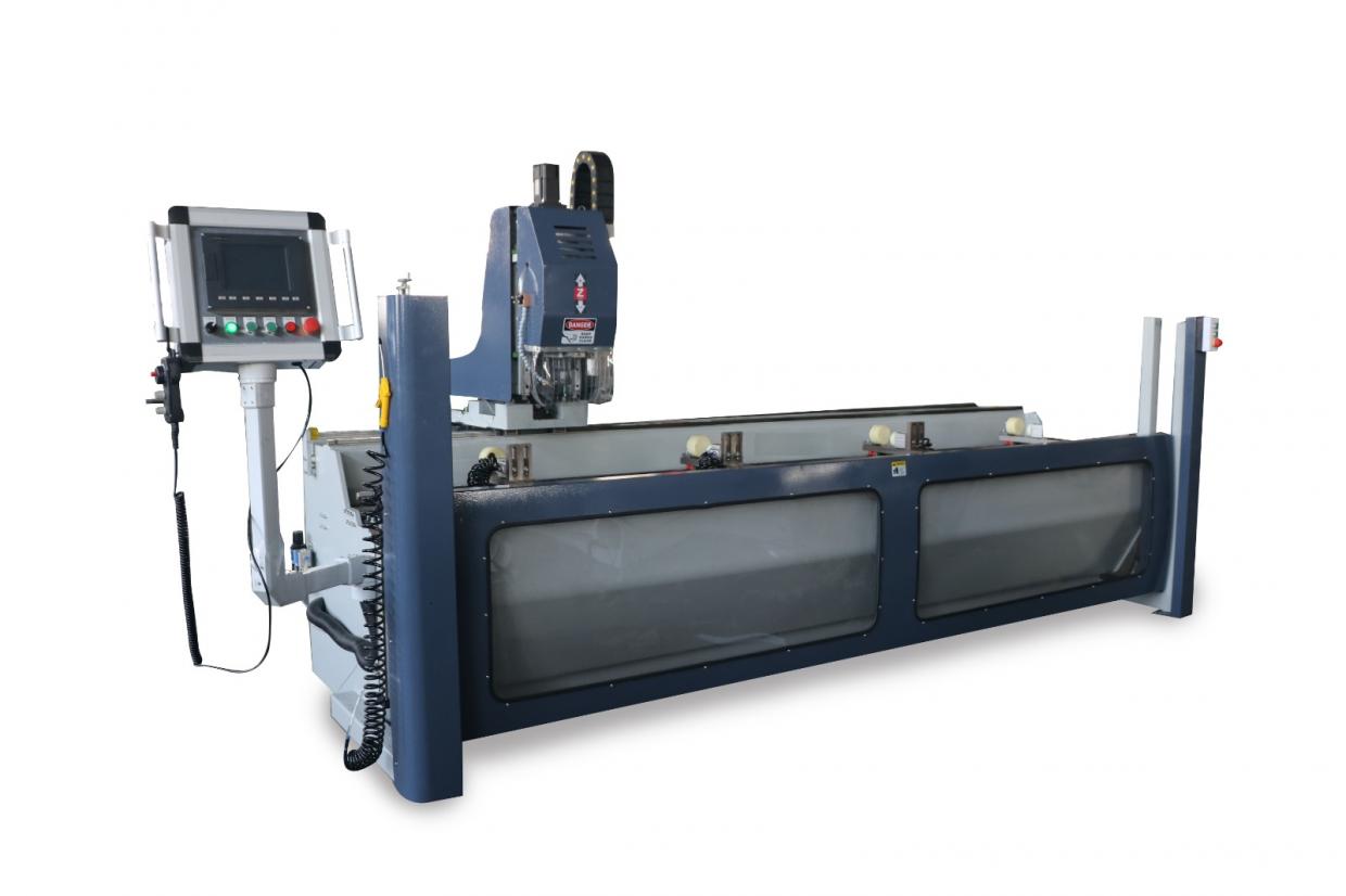 Centro de mecanizado de 3+1 ejes con bancada rotativa neumática +90º/-90º que permite trabajar las 4 caras del perfil.