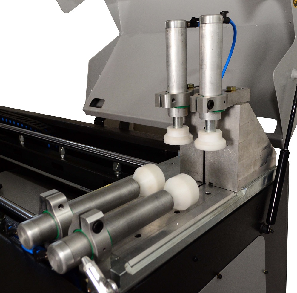 -       6 (seis) mordazas neumáticas para sujetar la barra: 2 verticales y 2 horizontales de un lado y el otro del disco respectivamente y otras 2 en carro de alimentación.